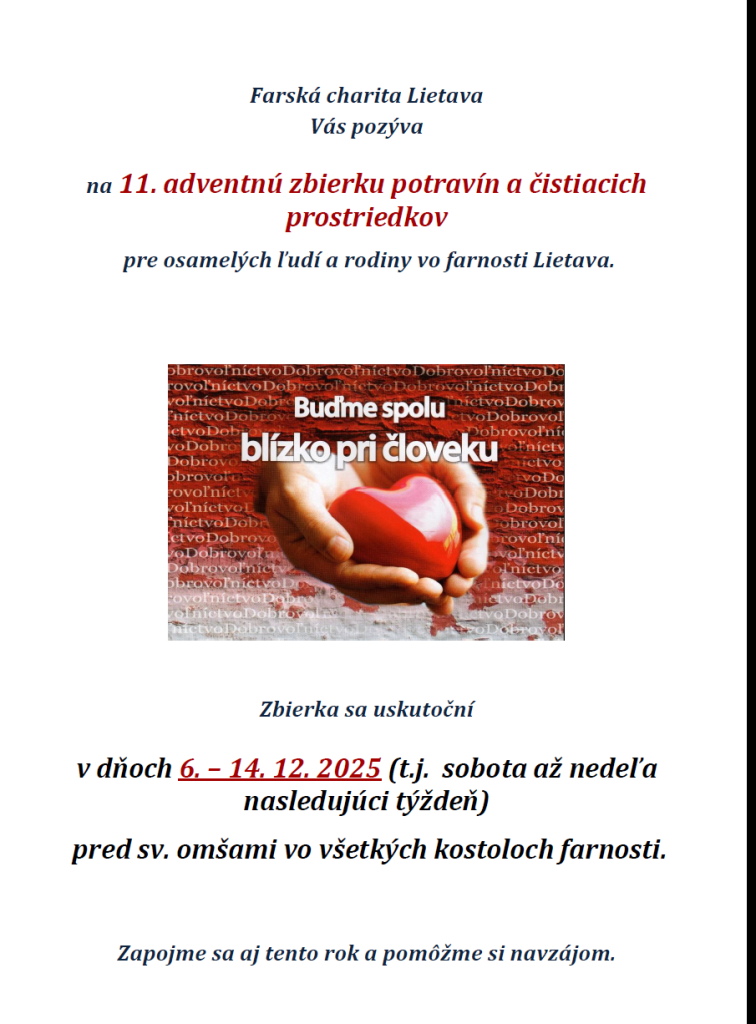 blíži sa obdobie Vianočných sviatkov a pri tejto príležitosti je u nás zvykom myslieť viac na svojich blížnych. Farská charita Lietava organizuje preto už tradičnú adventnú zbierku potravín a čistiacich prostriedkov pre ľudí a rodiny v našej farnosti, ktorí sú v ťažkej situácii