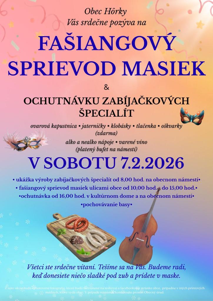 Obec Hôrky - starosta obce a poslanci Obecného zastupiteľstva si Vás dovoľujú srdečne pozvať na Fašiangy v sobotu 7.2.2026 ako za starých čias, kde budete môcť zažiť atmosféru pravého fašiangového veselia. Tešíme sa na Vás.