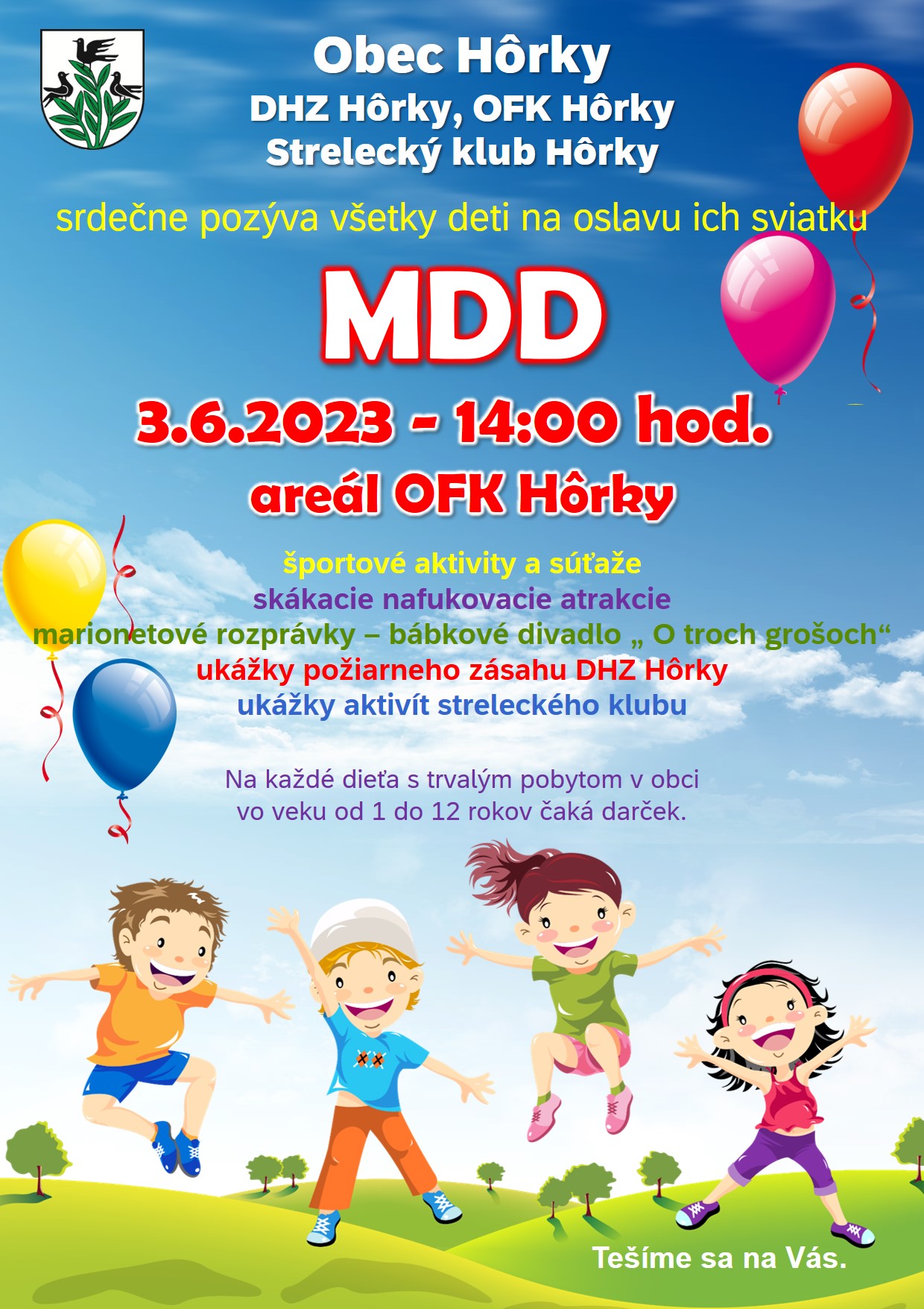 Milé detičky, srdečne Vás pozývam v mene obce Hôrky na oslavu Vášho sviatku "Medzinárodného dňa detí", ktorá bude v sobotu 3.6.2023 so začiatkom o 14,00 hod. v areáli OFK Hôrky. Tešíme sa na Vás :-) Dušan Chvíľa - starosta a poslanci OZ