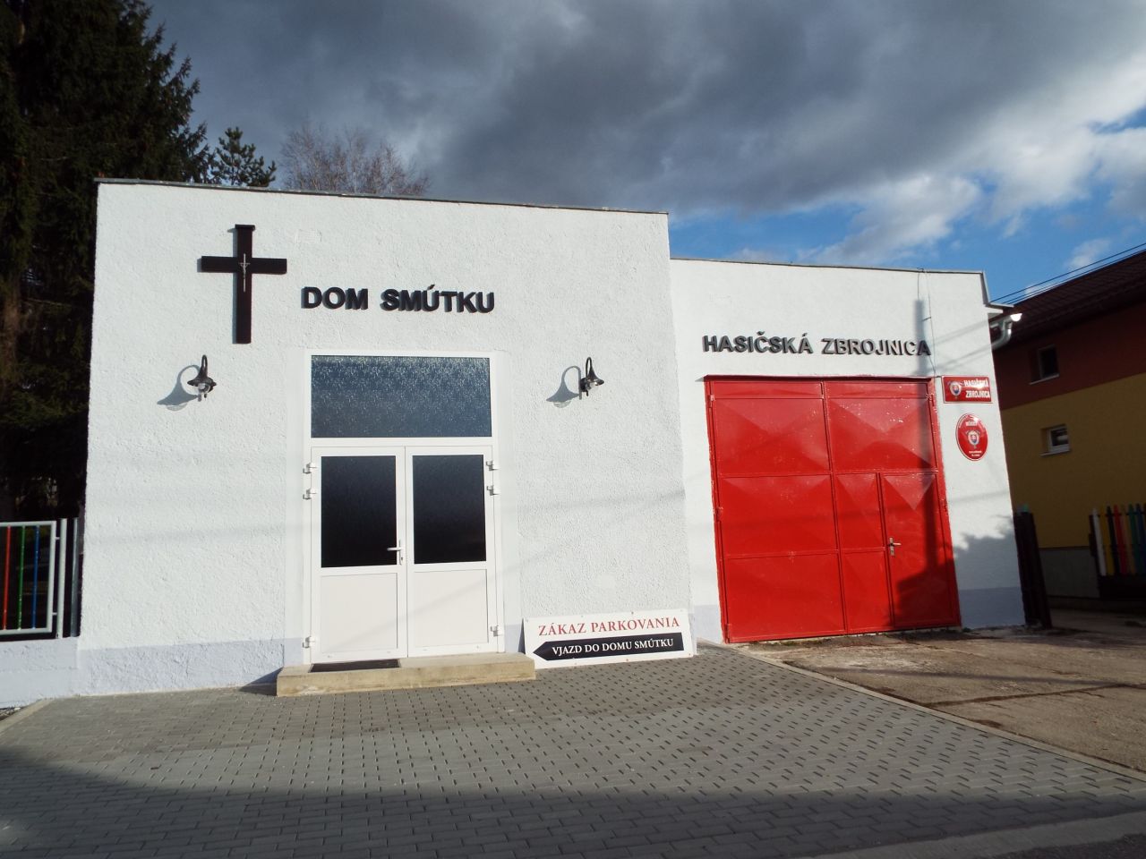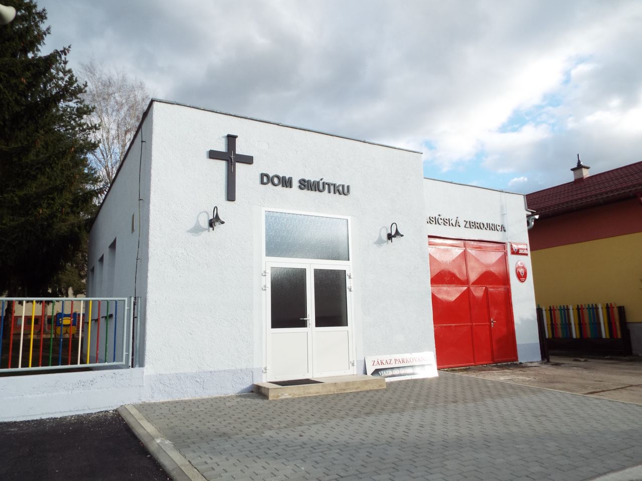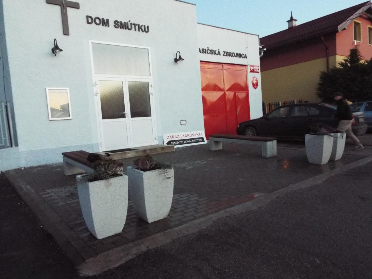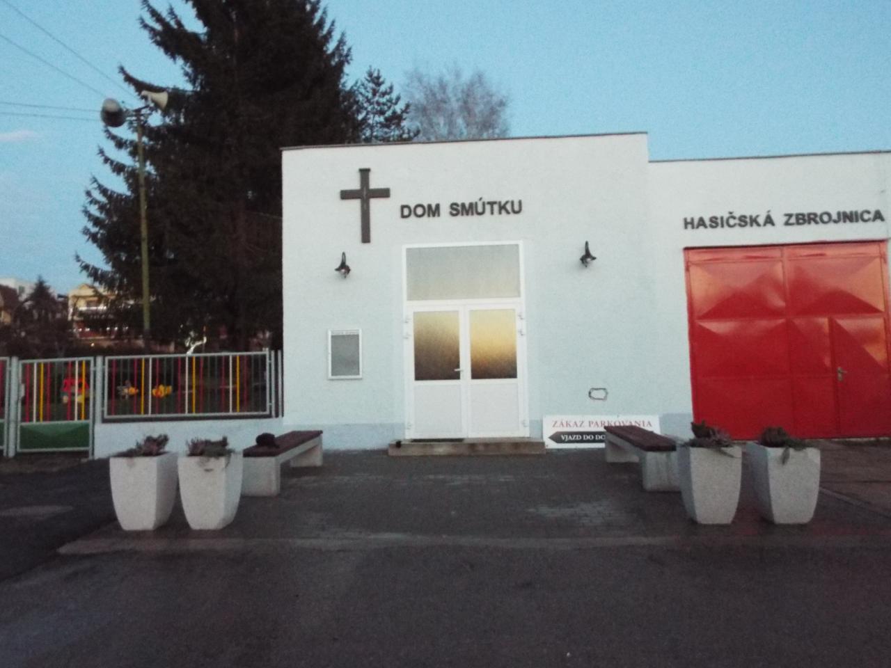 Budova Domu smútku a Hasičskej zbrojnice po oprave fasády 2018. V roku 2019 sme osadili pred domom smútku lavičky a kvetináče s výsadbou. V roku 2020 bola nainštalovaná strieška nad vchodom do Domu smútku.