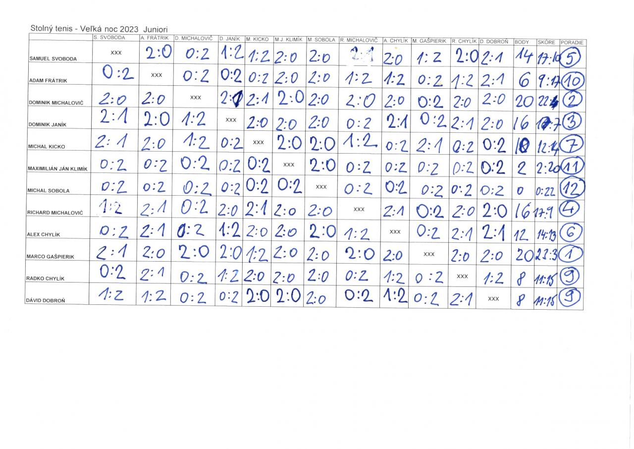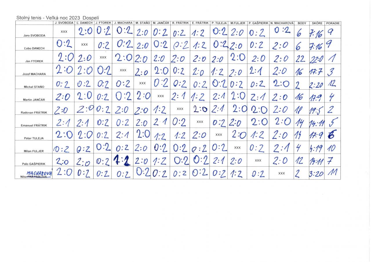 Dňa 8.4.2023 na veľkonočnú sobotu sa v KD v Hôrkach uskutočnil už 6. ročník turnaja v stolnom tenise. Zúčastnilo sa ho 12 účastníkov v kategórii juniori a 12 účastníkov v kategórii dospelí. Jedinou zúčastnenou dámou bola Nikolka Macharová. Umiestnenie a víťazov jednotlivých kategórií nájdete vo fotogalérii. Ďakujem Ivanke Jánošíkovej a Milanovi Fuljerovi - poslancom OZ za pomoc pri organizačnom zabezpečení turnaja. Ďakujem aj p. Ľ. Taškovi technickému riaditeľovi zo spoločnosti SAD Žilina a p. Ľ. Kypeťovi, riaditeľovi spoločnosti IMPA Žilina, s.r.o., za darovanie cien pre ocenených. Ešte raz ďakujem všetkým zúčastneným za zdarný priebeh turnaja.